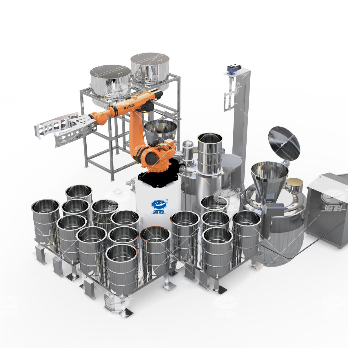 该系统由中央系统控制,采用机器人抓取投料,过程稳定高速。